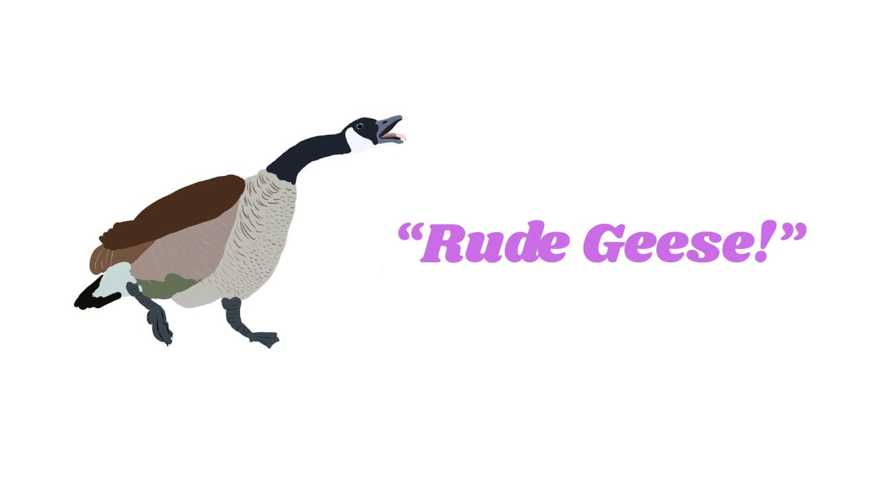 The geese were not frightened, but luckily, they also weren’t interested in a full assault. They moved past Philothea, with each goose stopping in turn to hiss.